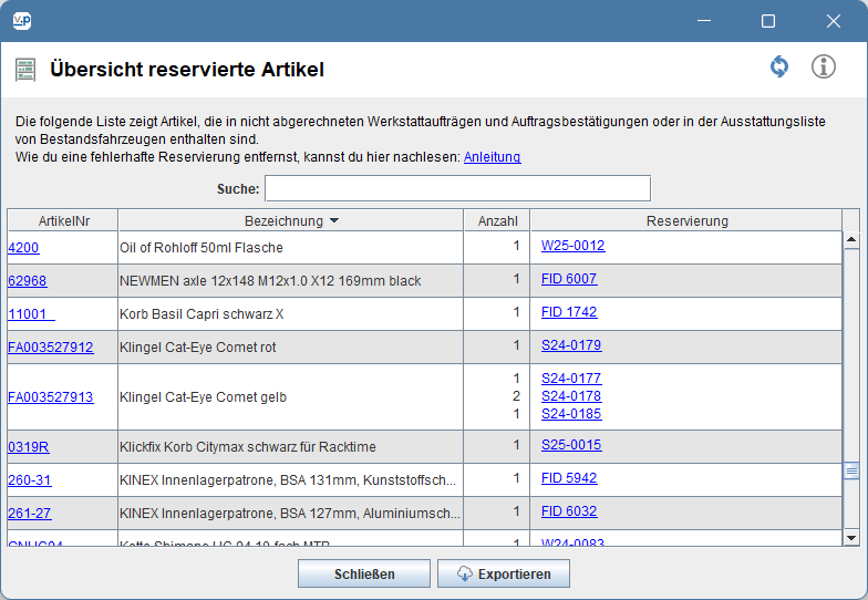 - Artikel in offenen Werkstattaufträgen