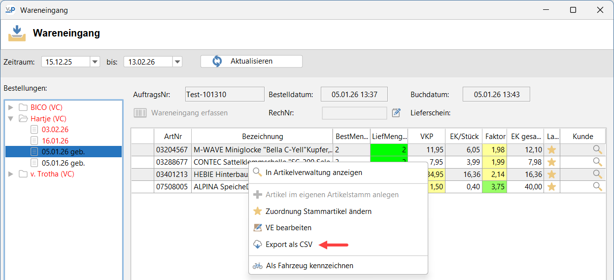 Per Rechtsklick auf den Positionsbereich eines gebuchten Wareneingangs kannst du diesen als CSV-Datei exportieren:
